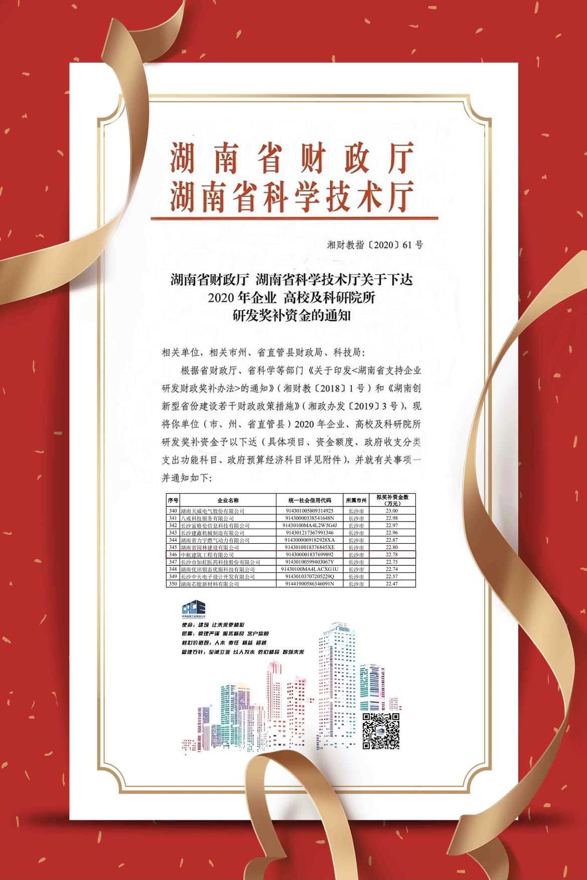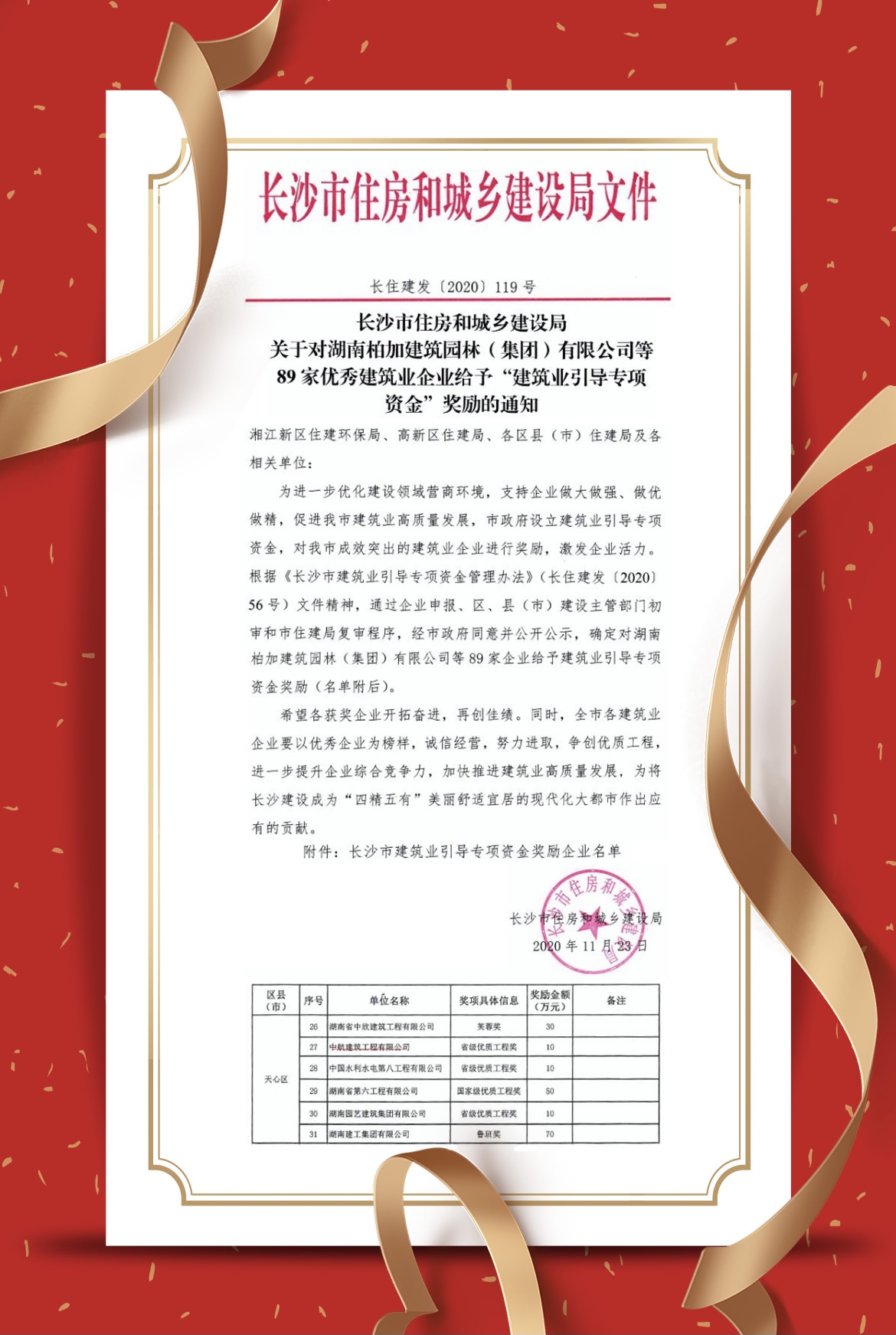 根據(jù)《湖南省財政廳、科學(xué)技術(shù)廳關(guān)于下達2020年企業(yè)、高校及科研院所研發(fā)獎補資金的通知》及《長沙市住房和城鄉(xiāng)建設(shè)局“關(guān)于對89家建筑業(yè)企業(yè)給予建筑業(yè)引導(dǎo)專項資金”獎勵的通知》(長住建發(fā)【2020】119號文件)精神,我司喜獲“研發(fā)獎補資金22.78萬元”和優(yōu)秀建筑業(yè)企業(yè)“建筑業(yè)引導(dǎo)專項資金10萬元”,這標志著各級行政主管部門對我司在行業(yè)內(nèi)領(lǐng)先的施工技術(shù)和先進管理水平的高度認可。