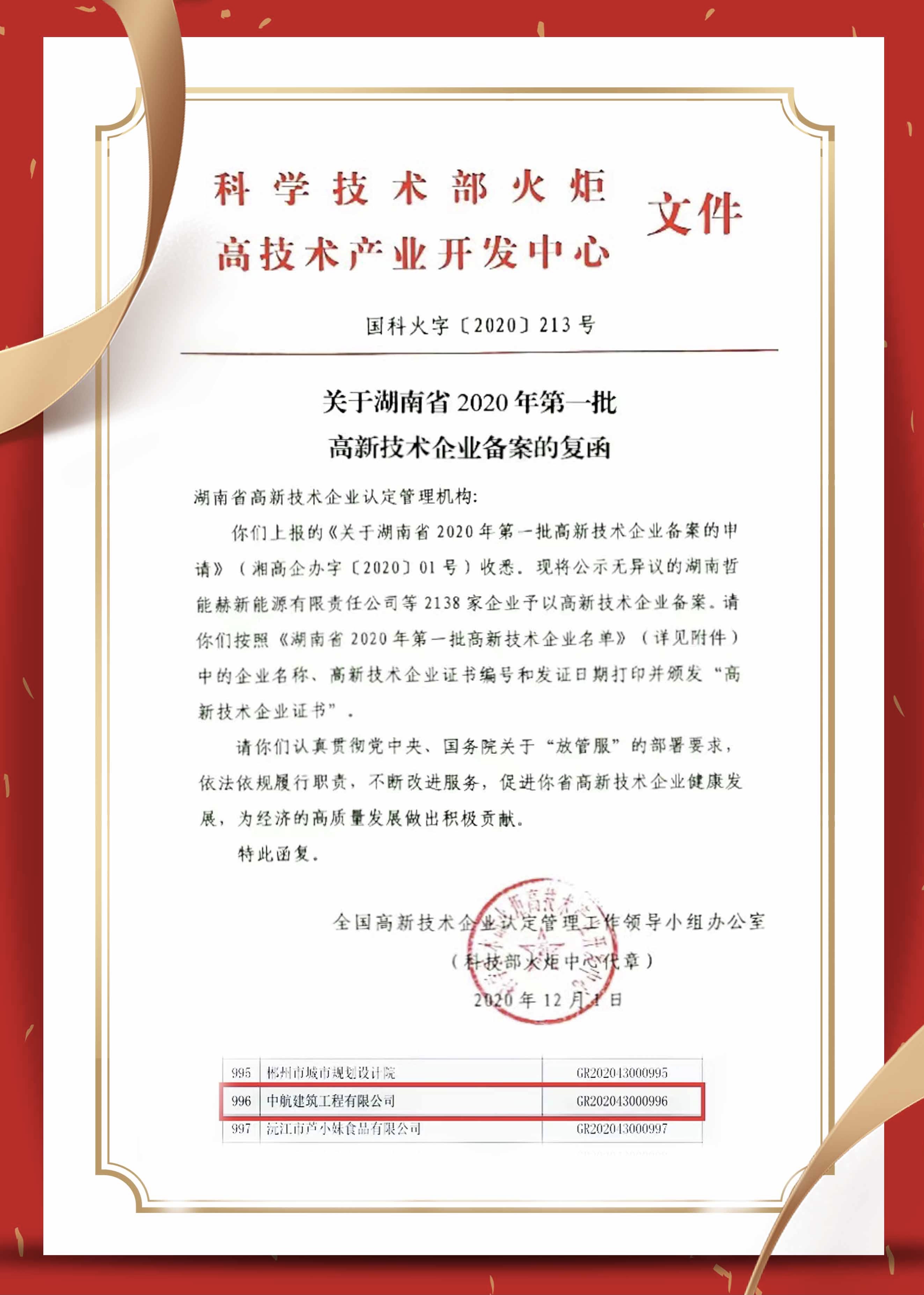 近日,公司順利通過了國家“高新技術(shù)企業(yè)”再次認(rèn)定,獲得由湖南省科學(xué)技術(shù)廳、湖南省財(cái)政廳、國家稅務(wù)總局、湖南省稅務(wù)局聯(lián)合頒發(fā)的高新技術(shù)企業(yè)證書。這是繼2017年首獲“高企”認(rèn)定三年期滿之后,公司再次獲得此項(xiàng)殊榮。